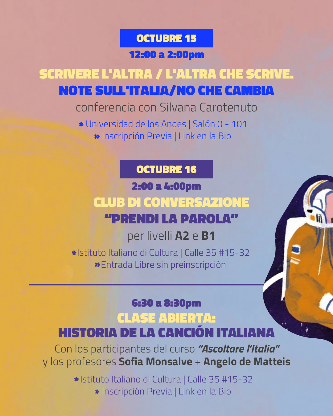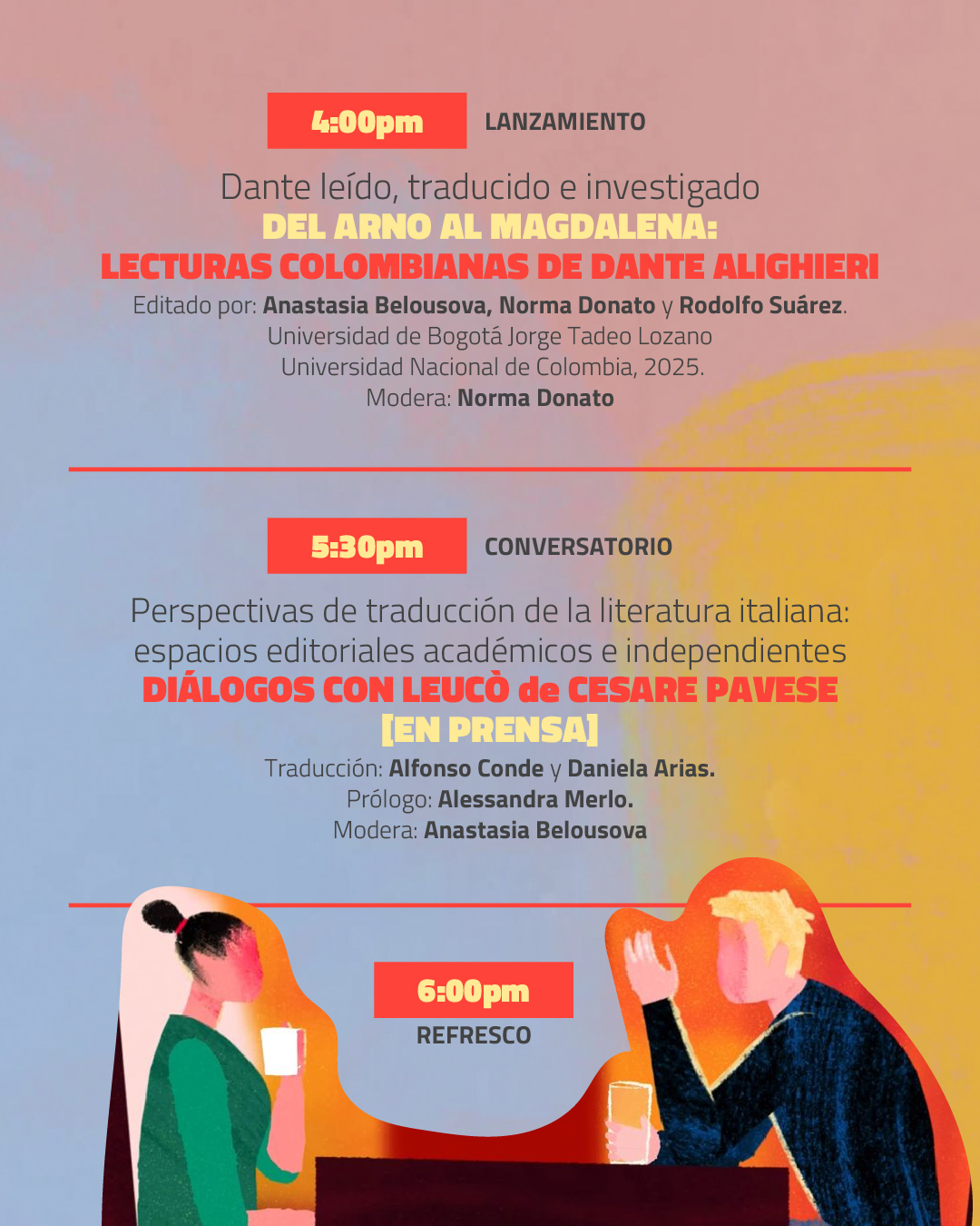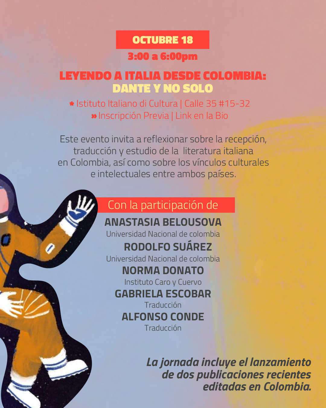 - sábado 18 de octubre, de 3:00 a 6:00pm “Leyendo a Italia desde Colombia: Dante y no solo“. Un evento para reflexionar sobre la recepción, traducción y estudio de la literatura italiana en Colombia, así como sobre los vínculos culturales e intelectuales entre ambos países.