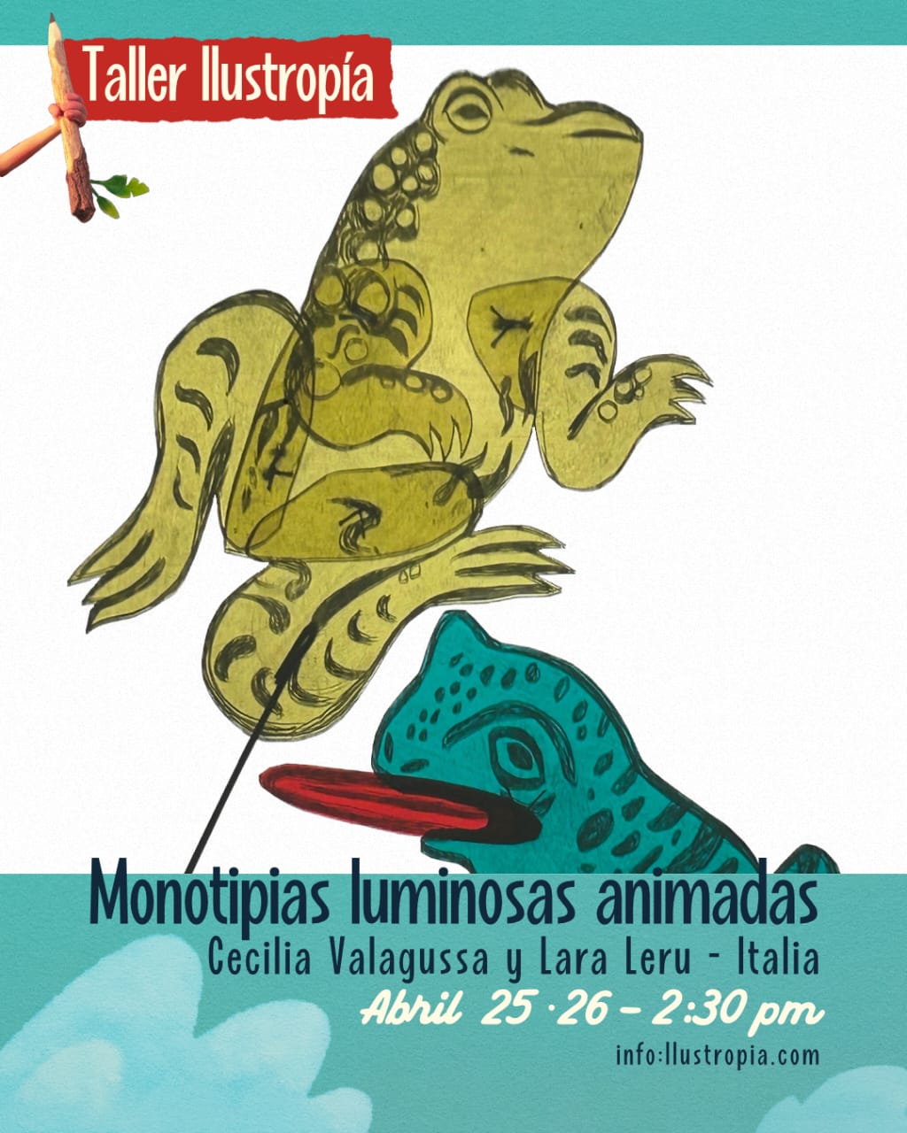 LABORATORIO: Monotipie luminose animate, Sabato 25 e Domenica 26 aprile dalle 14:30 alle 17:30 presso Casa Tinta. In questo laboratorio i partecipanti impareranno la tecnica della monotipia, una tecnica di stampa artistica in cui si realizza un’unica stampa a partire da un disegno su una lastra o superficie, e la tecnica dell’animazione analogica. Per maggiori informazioni: https://ilustropia.com/lara-leru/